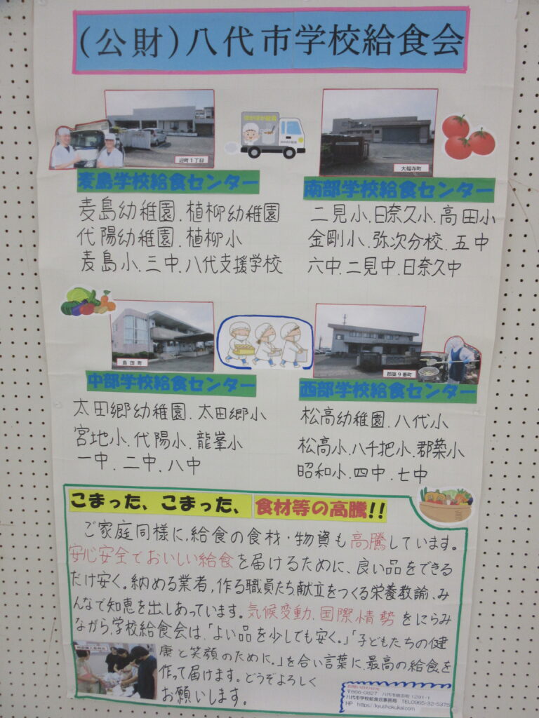 1月21日から、八代市ゆめタウンで、給食週間作品展が始まりました。八代市の学校・幼稚園の子どもたちが作った給食に関する作品が展示されています。絵画、習字、作文やお手紙など、子どもたちの給食への思いがよく表現されています。私たち給食を作って提供している者たちにとっては大切なラブレターです。「子どもたちはおいしく食べてくれているのかな?」「味はどうだったのかな?」と思っていますが、その答えがこの作品の中にあります。たくさんのメッセージをしっかり受け取りました。そして、また今日からおいしい給食づくりにがんばれます。ちなみに、学校給食会の紹介も少しだけさせていただいています。ご覧ください。